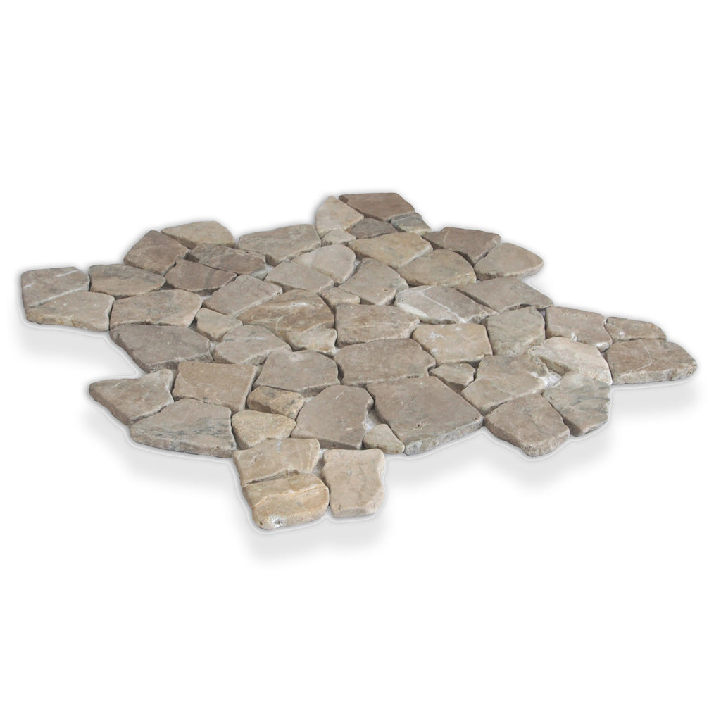 A perfect option for expansive interior floors and walls as well as outdoor areas including patios and courtyards, Large Random exudes a rustic presence through the use of tumbled stones varying in size and shape. The large, irregular stones make a tastefully bold statement.
