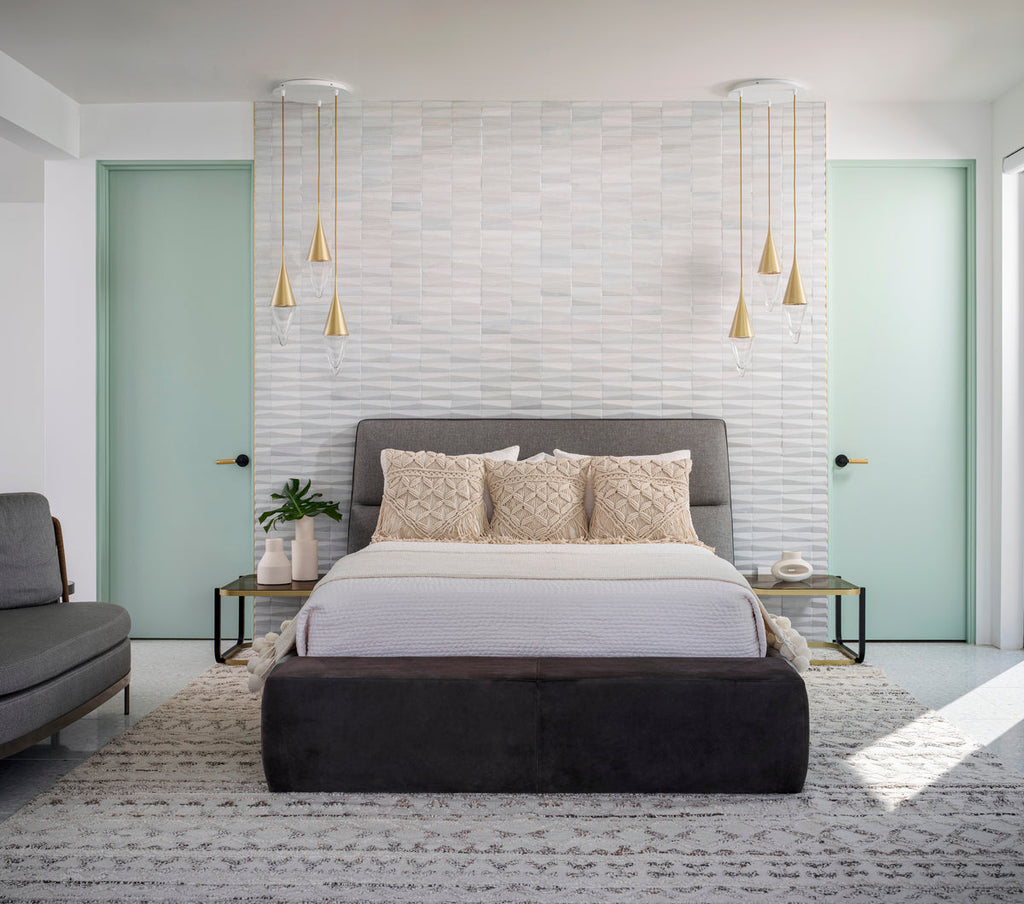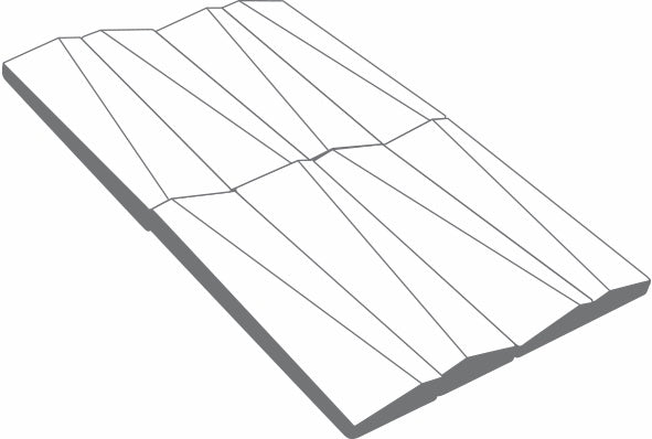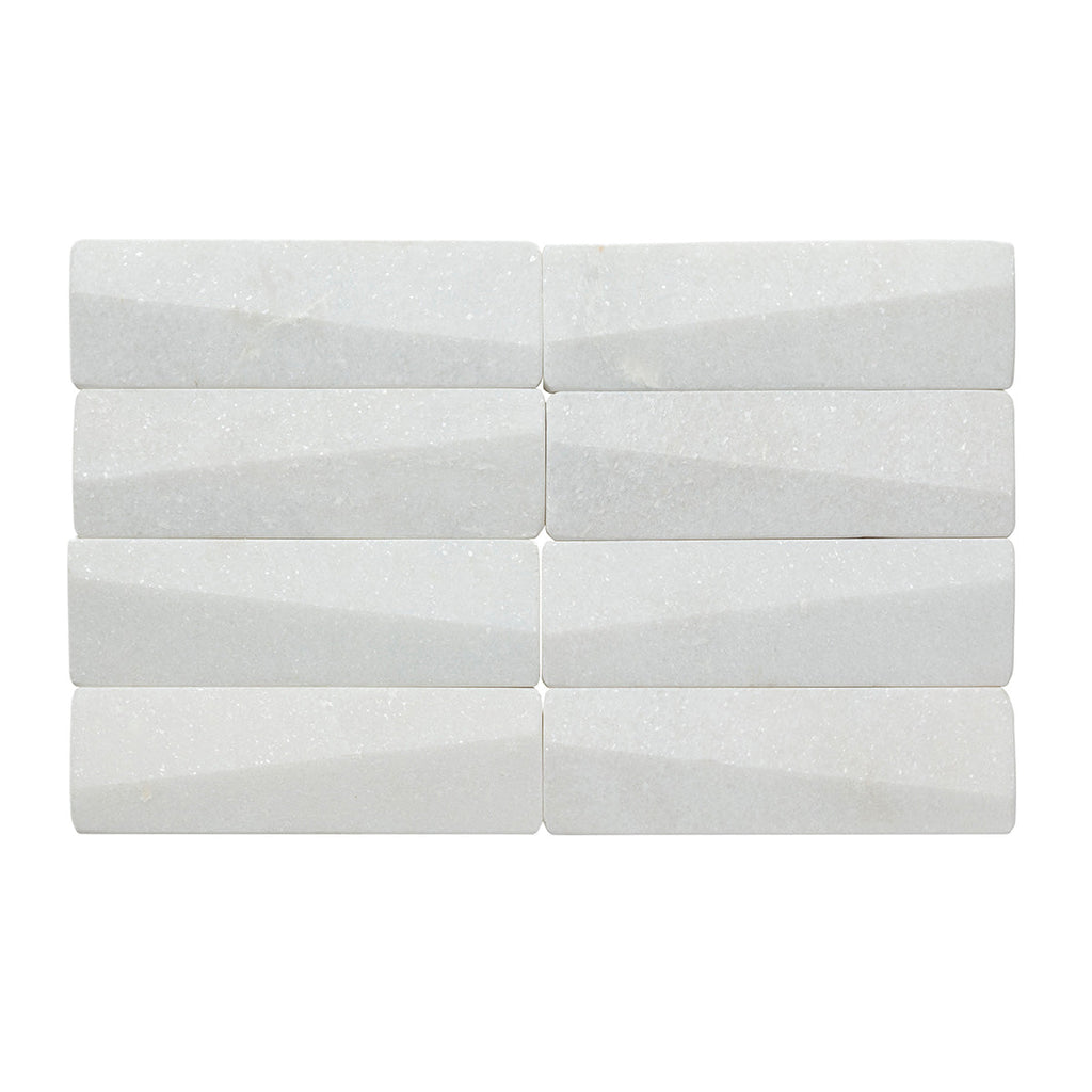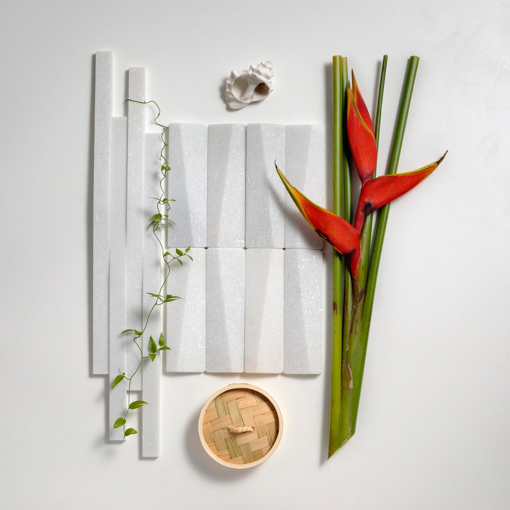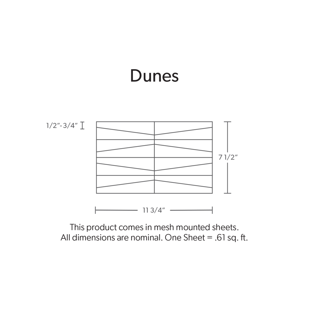 The Dunes series of elongated dimensional subway tiles, are sculpted with an offset angled surface, forming a flow of connected ridges reminiscent of wind-swept sand dunes. The tapering trapezoid relief dances across the wall surface, creating shadows while remaining contemporary and clean. Each color's surface softens its geometric design, creating a marble-like finish.
