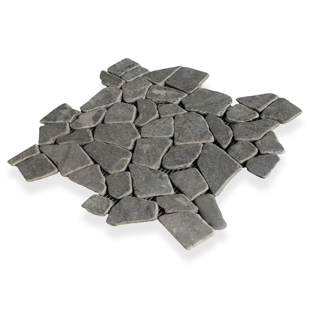 The Random series of tiles is assembled through the use of "pique assiette" a French phrase meaning "stolen from the plate". Irregular pieces of slightly tumbled stone are pieced together by master craftsmen to create a truly individual mosaic that interlocks seamlessly. Random is available in a wide range of neutral tones as well as a the more brightly colored, veined Forest Marble Mix.